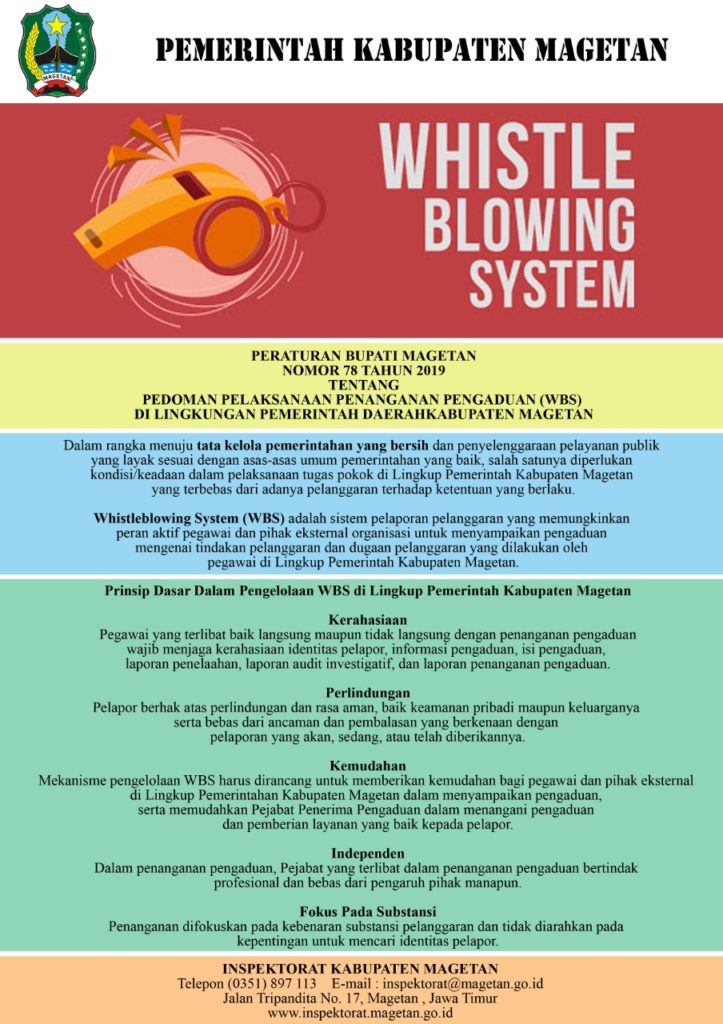 Whistle Blowing System adalah sistem pelaporan pelanggaran yang memungkinkan setiap orang untuk melaporkan adanya dugaan kecurangan, pelanggaran hukum dan etika serta misconduct lainnya yang dilakukan oleh Instansi Pemerintahan di Kabupaten Magetan.